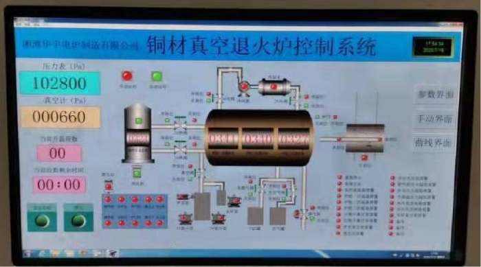 線盤臥式放置在工裝架上,工裝架放置在爐前移動小車上,液壓推桿將料架推入爐膛,在液壓系統(tǒng)作用下,爐門自動關閉,在控制系統(tǒng)預先設置的工藝參數(shù)下,完成抽真空,充保護氣,加熱裝置啟動前安全檢測等一系列動作,如果達到工藝運行環(huán)境要求,啟動加熱并完成工藝加熱過程。在整個工藝過程中,計算機及PLC控制系統(tǒng)全程對爐壓、氧含量、溫度均勻度、爐起循環(huán)速度、加熱速度等自動調(diào)節(jié),完成工藝過程。加熱完畢,加熱系統(tǒng)自動關閉。